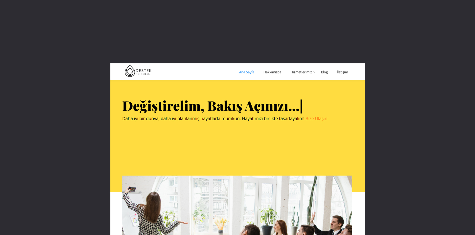Psikolojik destek sağlayan, eğitim ve danışmanlık hizmeti veren Destek Psikoloji firmasının web Sitesi. Tasarlayan: @buniforma.com & Teknik: HTML, Galeri-lightbox, ana sayfa daktilo yazı geçişli slayt, blog.
